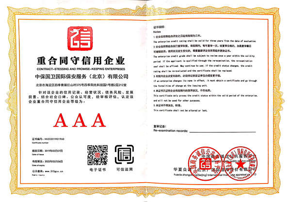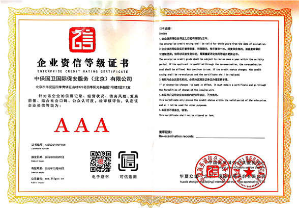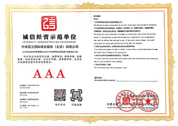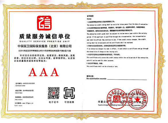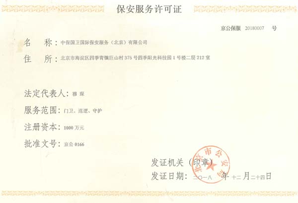 中保國衛(wèi)國際保安服務(wù)(北京)有限公司,屬中保國衛(wèi)集團旗下子公司。能全方位的為大型客戶提供優(yōu)質(zhì)的安保、押運服務(wù),是集人防和技防于一體的新型正規(guī)化綜合安保押運服務(wù)企業(yè),提供人防、物防、技防、聯(lián)網(wǎng)報*、非武裝押運等安防相關(guān)的一站式服務(wù)。 公司在國內(nèi)多省設(shè)立有分公司及分支機構(gòu),著重提升安全押運、智能技術(shù)押運及安全技術(shù)防范相關(guān)的服務(wù),業(yè)務(wù)范圍覆蓋全國一、二線城市、港澳地區(qū)以及海外地區(qū)。安保方面主要為政府機構(gòu)、金融機構(gòu)、企事業(yè)單位、醫(yī)療衛(wèi)生、高等院校、工業(yè)園區(qū)、大型商場、高檔住宅、智能商務(wù)樓、大型活動提供門衛(wèi)、守護、巡邏、押運(非武裝)、安全檢查、保安特勤、私人護衛(wèi)、消防中控、安全技術(shù)防范、遠(yuǎn)洋護航等全方位服務(wù),同時面向國際市場,為中資企業(yè)在“一帶一路”沿線國家投資提供境外安保服務(wù)。 >> 更多內(nèi)容 |